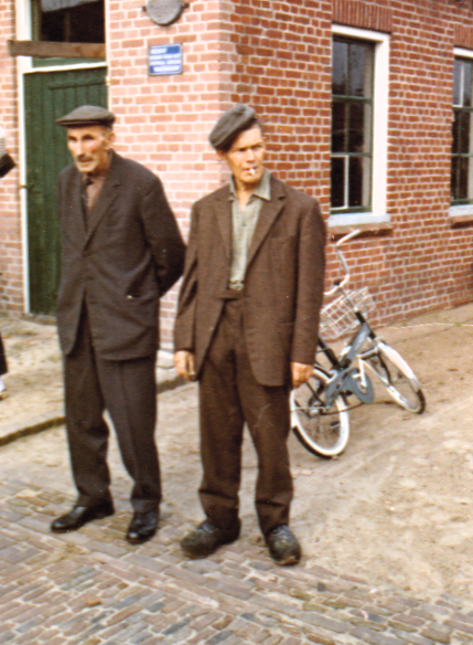 De heren Foppe Jansma links en Roel Duursma voor de wagenmakerij hoek Mounleane. Bij Merkebuorren 87