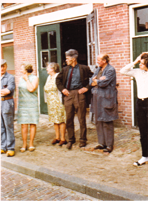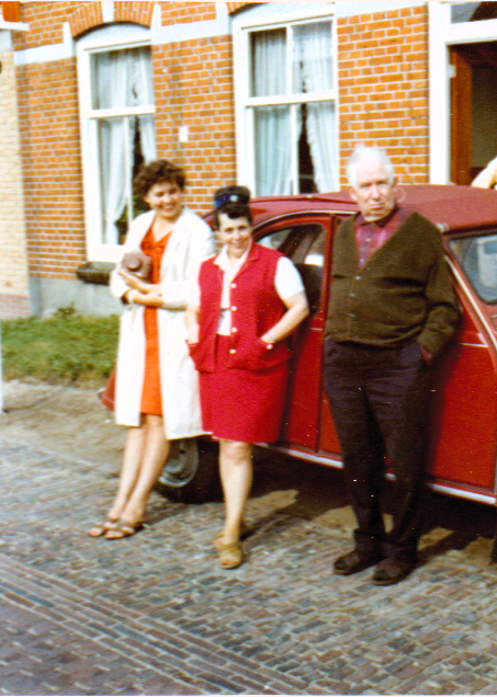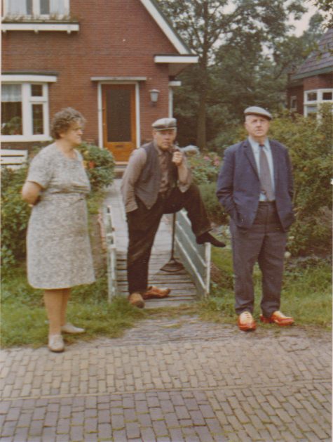 Het echtpaar Herlijn voor hun woning aan de Merkebuorren 79. Hun huis diende ook als Koninkrijkzaal voor Jehova getuigen bijeenkomsten. In het dagelijks leven was het een naaiatelier van mevr. Herlijn. De heer Herlijn kon mooi schilderen en menig achtergrond tafereel op versierde wagens was zijn creatie. Links van hen op de foto is Wieke Post – de Haan.