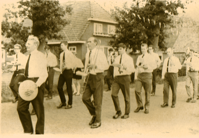 Euphonia voor Bakkerij Bosma, Merkebuorren 107, jaren 70? Euphonia dirigent Jan Heida Jopie Boonstra Jan Heida tijdens optocht dorpsfeest op feestterrein dorpsfeest aan Tolleane t.o. Weinterp 9
