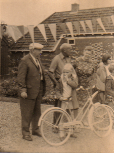 Een deel van de familie Smit. V.l.n.r. Fokje v.d. Ploeg-Smit, haar man Fedde met hun zoontje. Dan Jelle Smit en zijn vrouw Augusta en dan de vrouw van vermaard mollenvanger Anne Jager. Circa 1970. Huidige adres Klein Groningen 13.